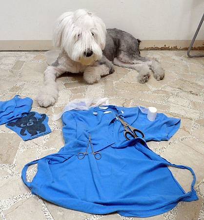 ALPHA盯著我 默默的看我忙碌: 領子的地方戳一些小洞綁上紗布條可以調整領口大小